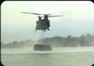 Bridge crewmembers in MK2 bridge boats work with CH-47 Chinook helicopters to transport and move sections of the bridge.